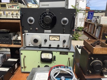 ... but I always prefer the test gear. The HP 202D on top is unusual. I didn't know there was such a thing. The HP 651B beneath it is a classic vintage solid-state wide-range R-C oscillator. And the rack-mount HP 400C is quite unusual. Aside from the odd green color paint, it has a tag that states that it is a "Voltmeter, Electronic, ME-30U, Gillifan Bros, Inc."