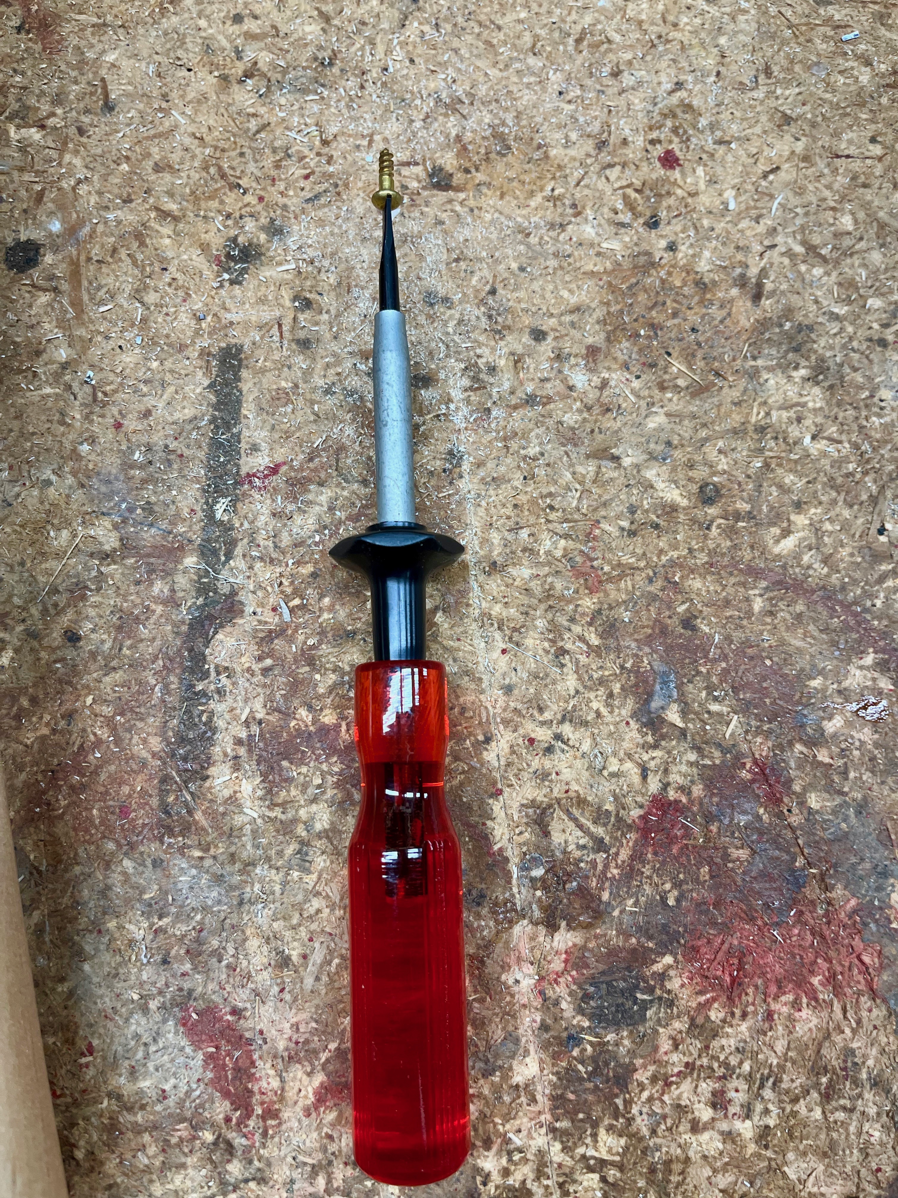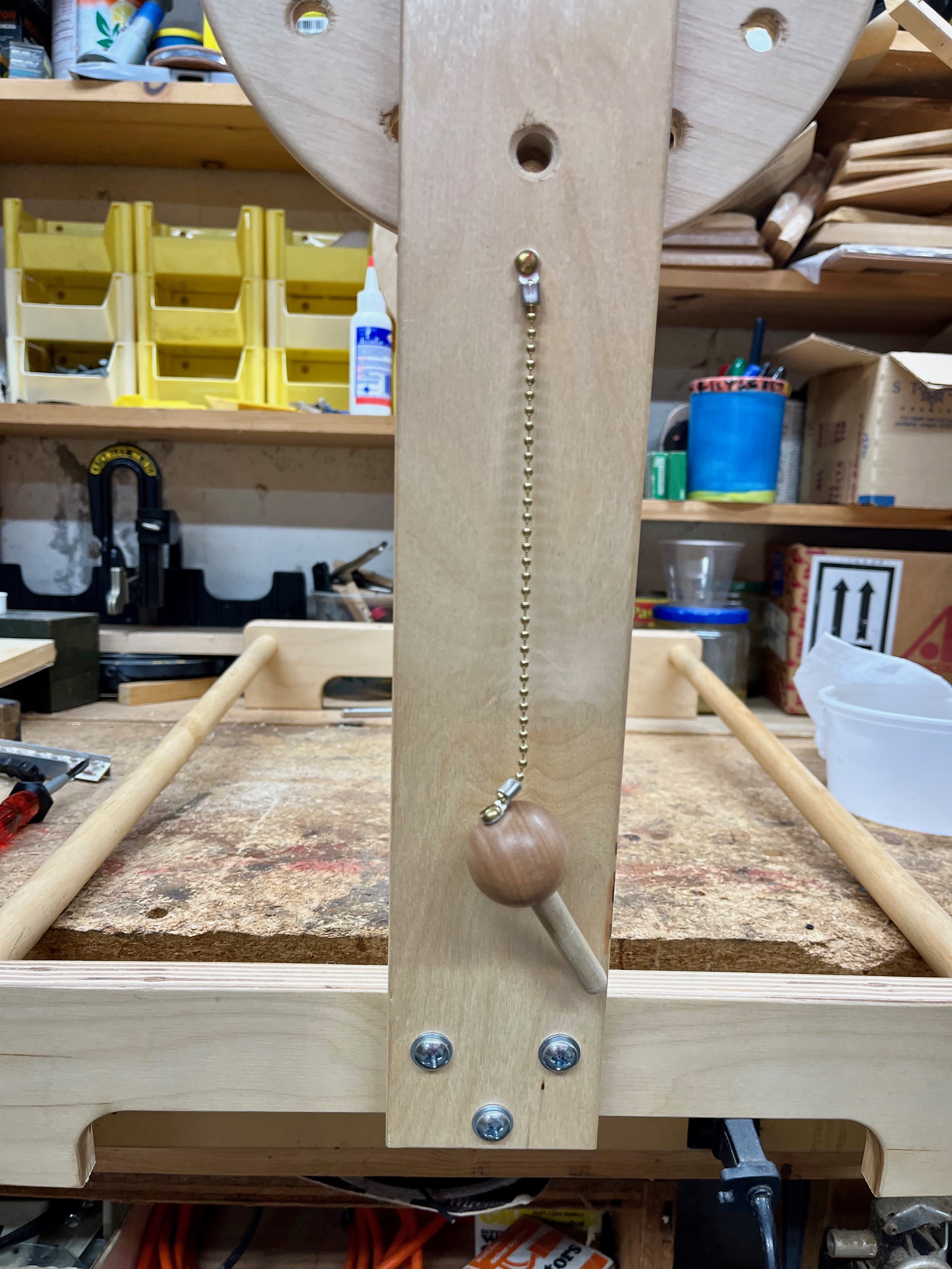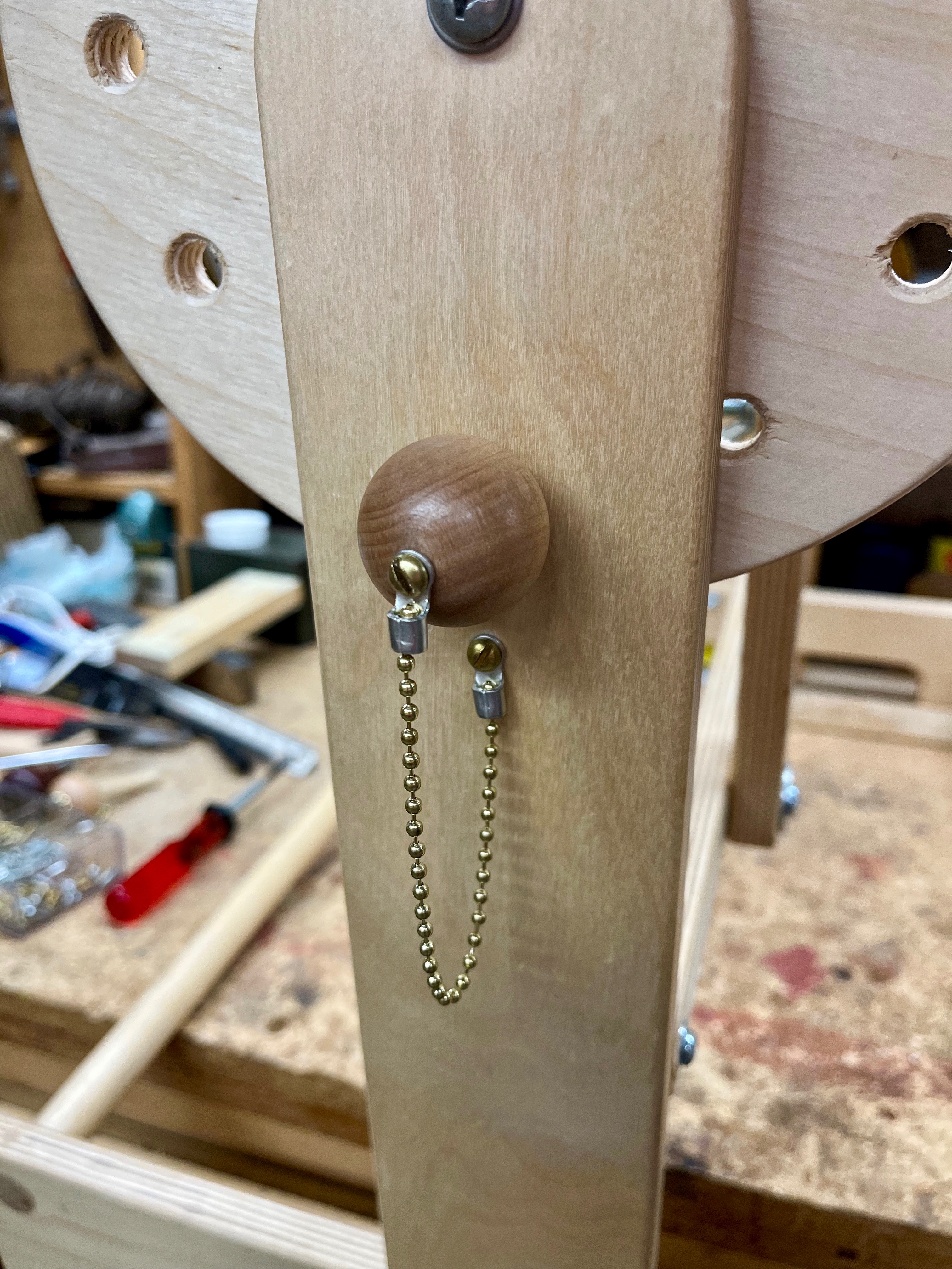 I used #6 x 1/2” round-head brass screws to fasten the chain to the pin and to the side of the stand. No more lost pins!